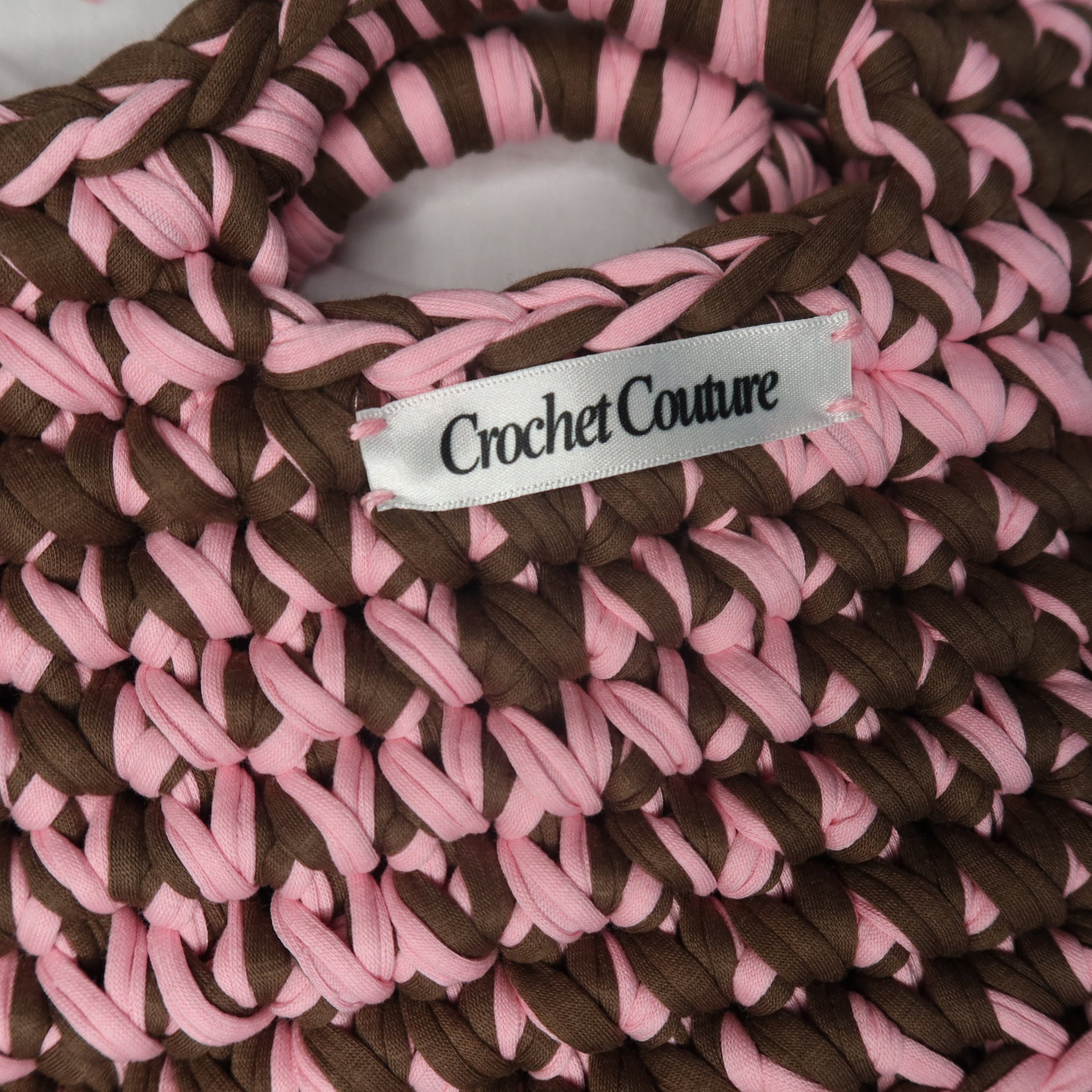 This mini shopper blends soft blush tones with rich chocolate hues, hand-crocheted into a structured silhouette that feels both romantic and bold.