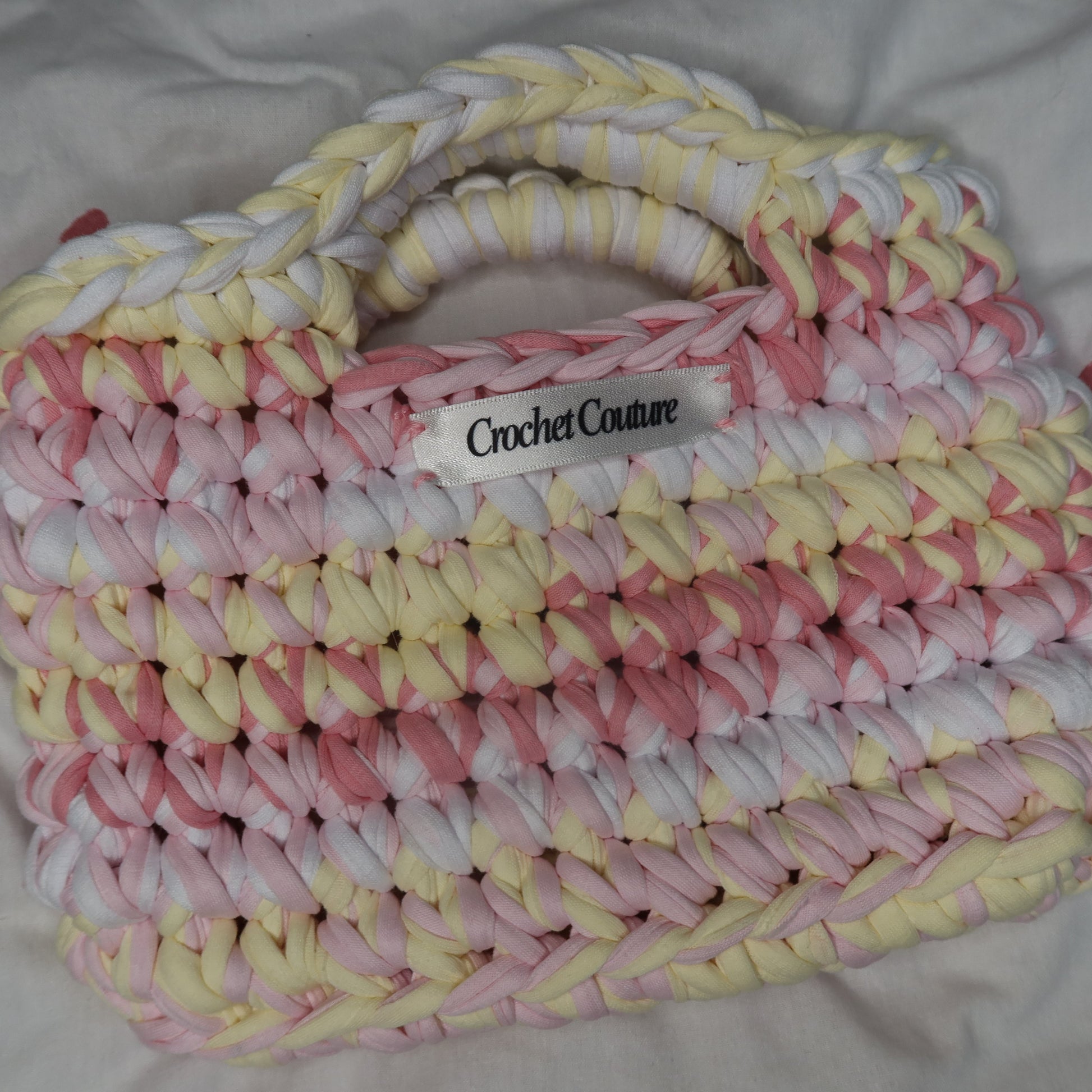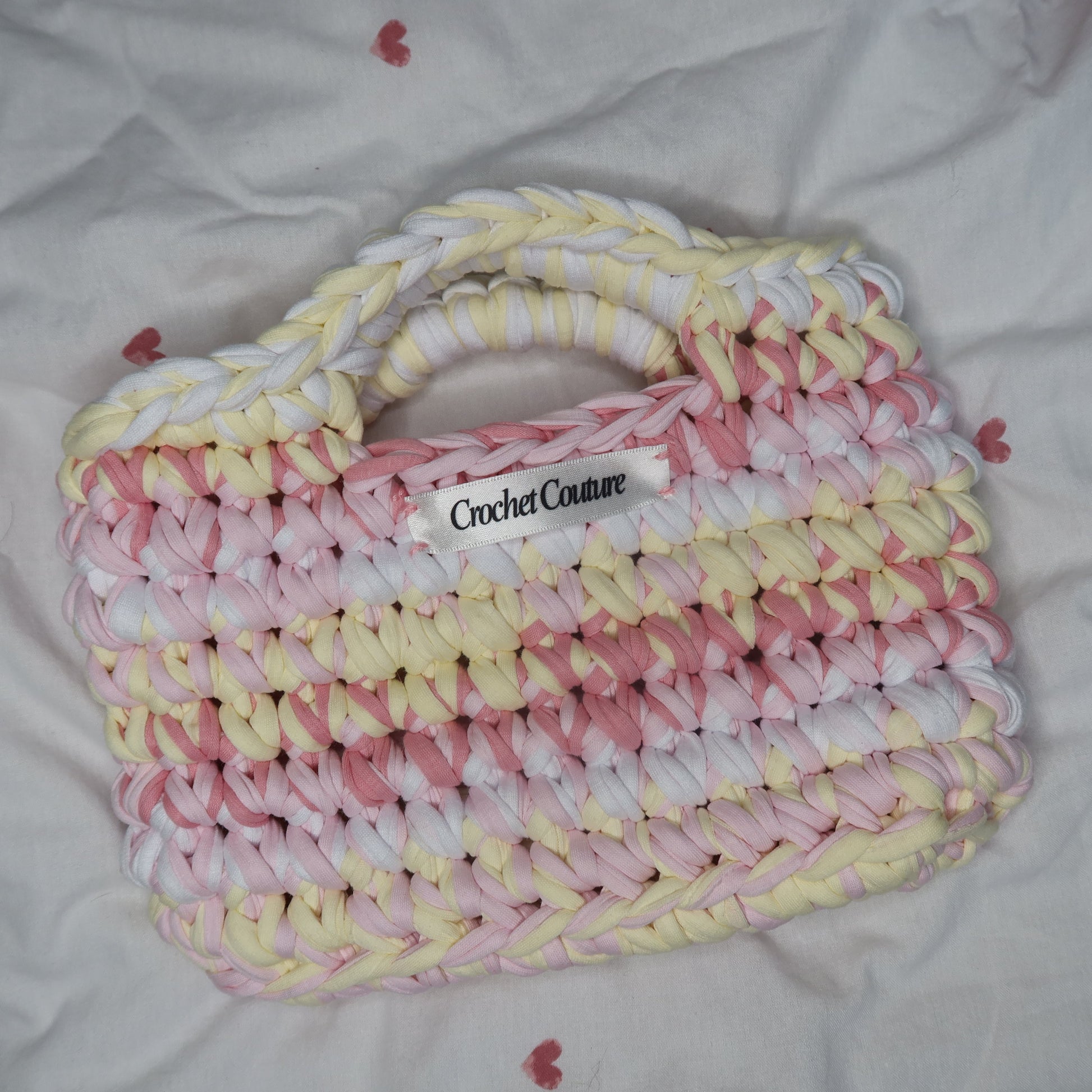 The Strawberry Cream Mini Shopper is hand-crocheted in a delicate blend of blush pink, butter yellow, and creamy white — inspired by slow mornings, fresh flowers, and romantic getaways.